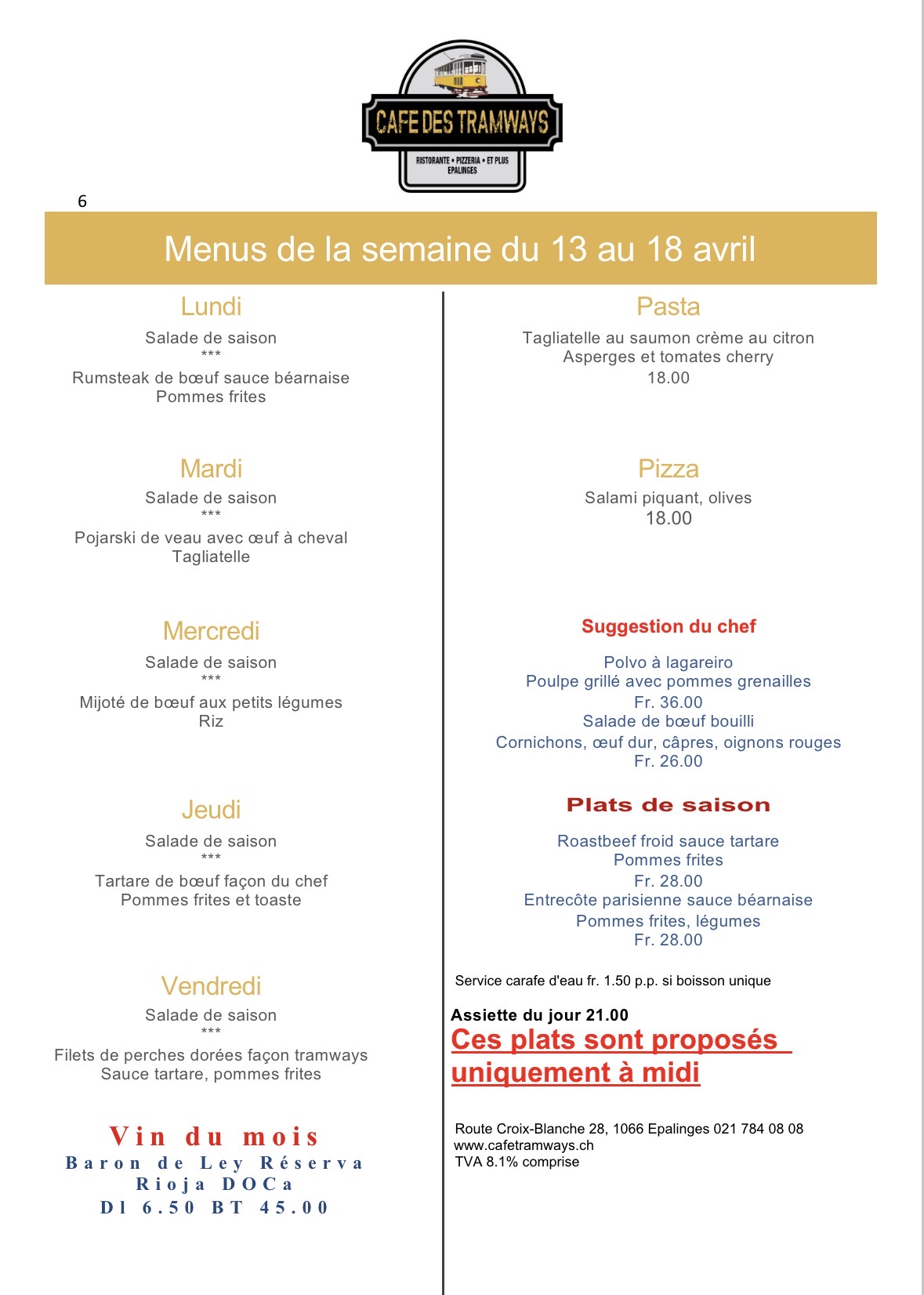 Tous les plats de notre carte permanente peuvent être commandés à l’emporter, Sauf menus et suggestions semaine.